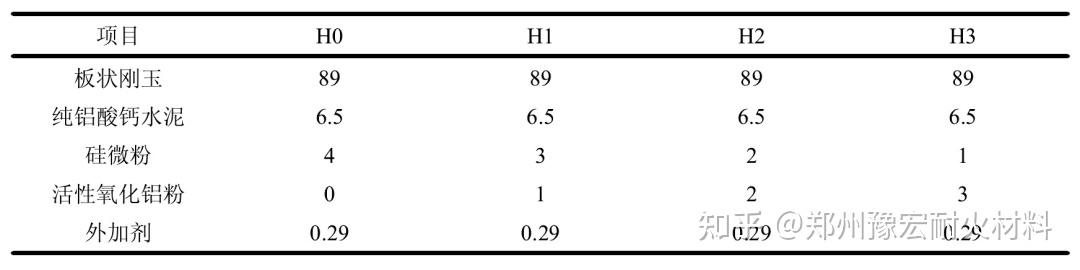 本試驗采用的主要原料板狀剛玉(10~5、5~3、3~1、≤1和≤0.088 mm)、硅微粉、活性氧化鋁粉、水泥等。主要原料化學組分見表1。