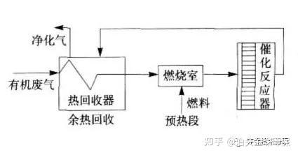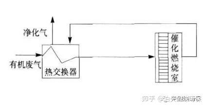 這種屬于比較基本的流程工藝,由于催化劑都有一個主要原理是有機廢氣的溫度在100℃以下并且濃度較低的情況下,這種情況熱量一般是不能自給的,因此需要在進入反應器之前,需要在預熱室內對其進行加熱升溫。一般所采用的預熱方式主要有煤氣或電加熱,這二種方式可以將廢氣升溫到催化反應所需要的起燃溫度,從而達到燃燒氧化分解的目的,燃燒氧化后的氣體在熱交換器內和沒有處理的廢氣進行熱交換,從而可以回收部分的熱量。