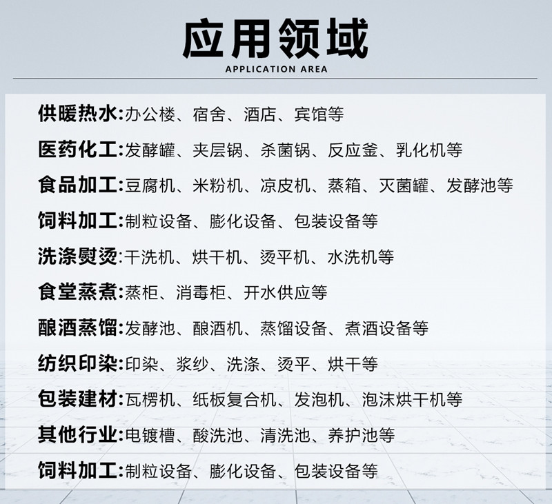 醫院,學校,紡織服裝行業,大型超市,酒店賓館,食堂餐廳,食品飲料行業,酒廠,制衣廠,印染廠,制藥廠,包裝廠,建材廠,涂料廠,飼料廠,塑料廠,橡膠,游泳館,洗浴中心,小區居民樓取暖,實驗室,茶葉藥材烘干,其他